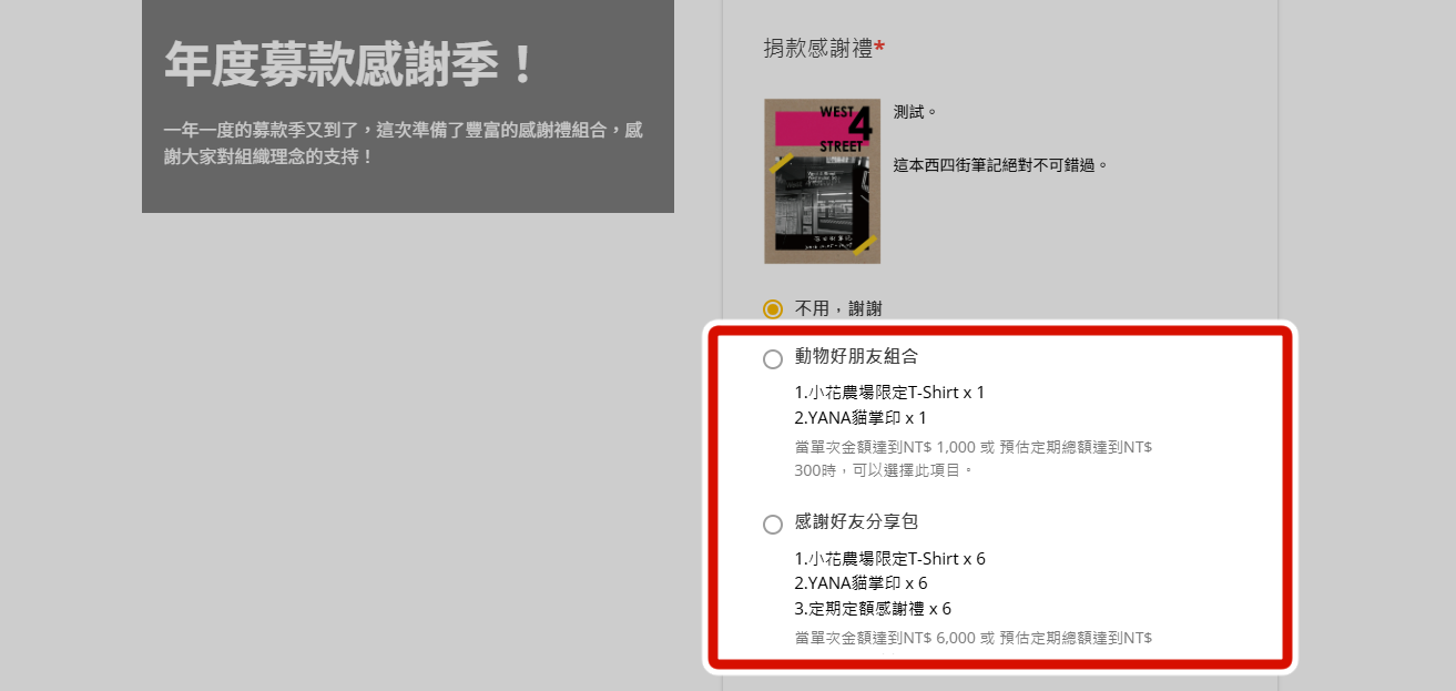 🔸 讓多項感謝禮變成一份超值🎁禮包——「感謝禮品組合」設定滿額贈、套裝禮,讓募款更像開禮盒!