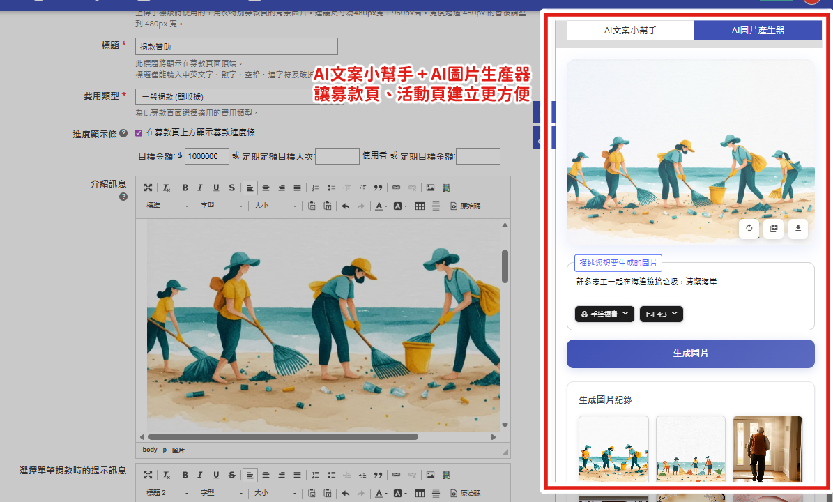在活動頁、捐款頁編輯介面旁新增「AI 圖片產生器」,提供多種風格參考。輸入文字描述即可快速產生配圖,讓內容撰寫與視覺製作一次完成、效率加倍。