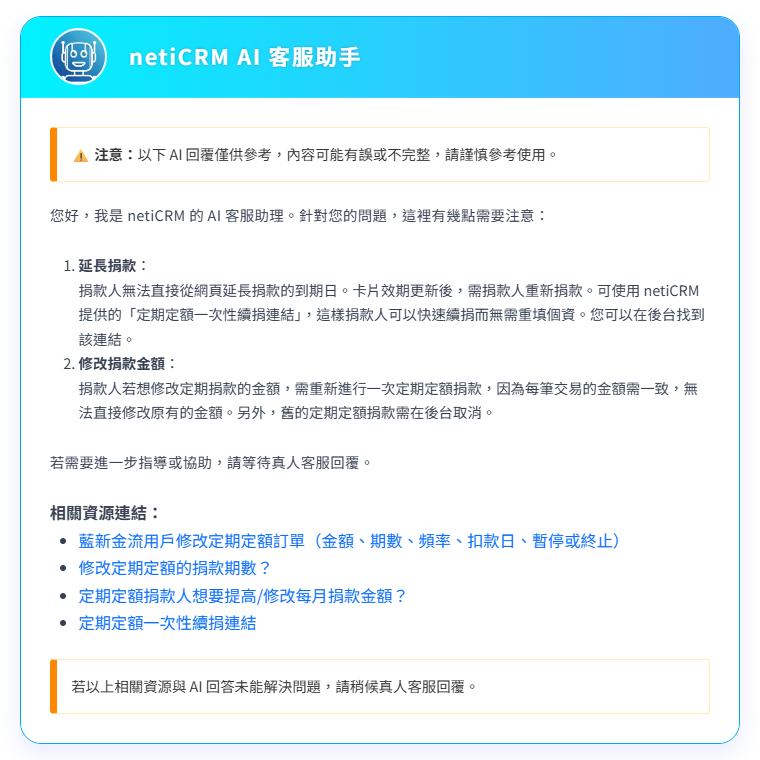 netiCRM 客服導入 AI 協助,提供第一時間的操作建議與解法;若仍有疑問,真人客服會接續支援。