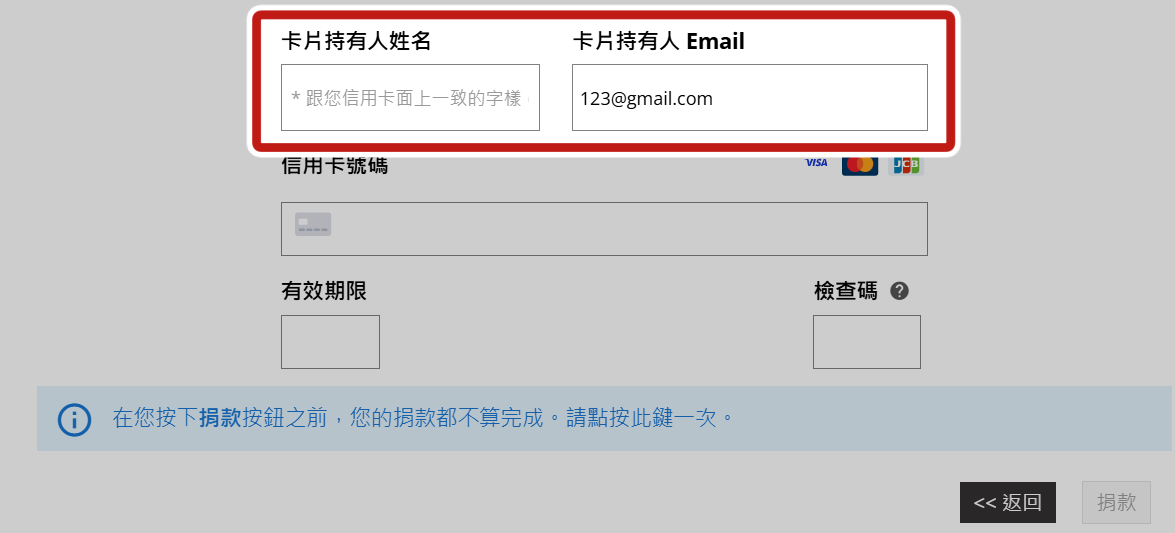 若為非 3D 驗證 ,則不會出現「卡片持有人姓名」與「卡片持有人Email」欄位。
