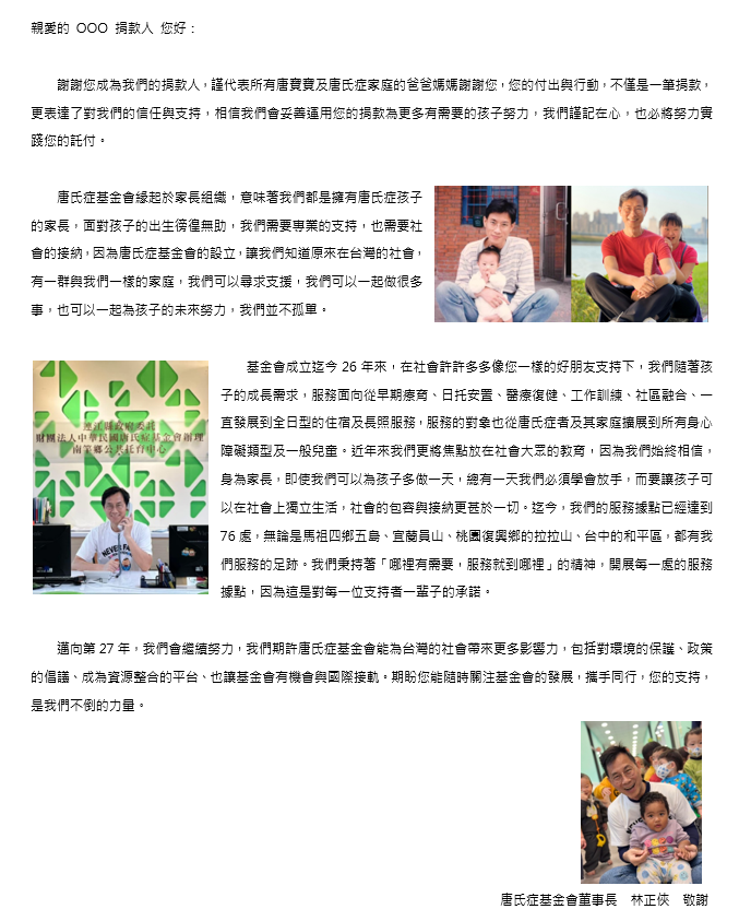 此外,唐氏症基金會的夥伴林季蔚也分享,感謝信的內容大多取材自官網與最新消息,並針對首次捐款人,最遲會在捐款後的次月底寄出,確保及時表達心意。