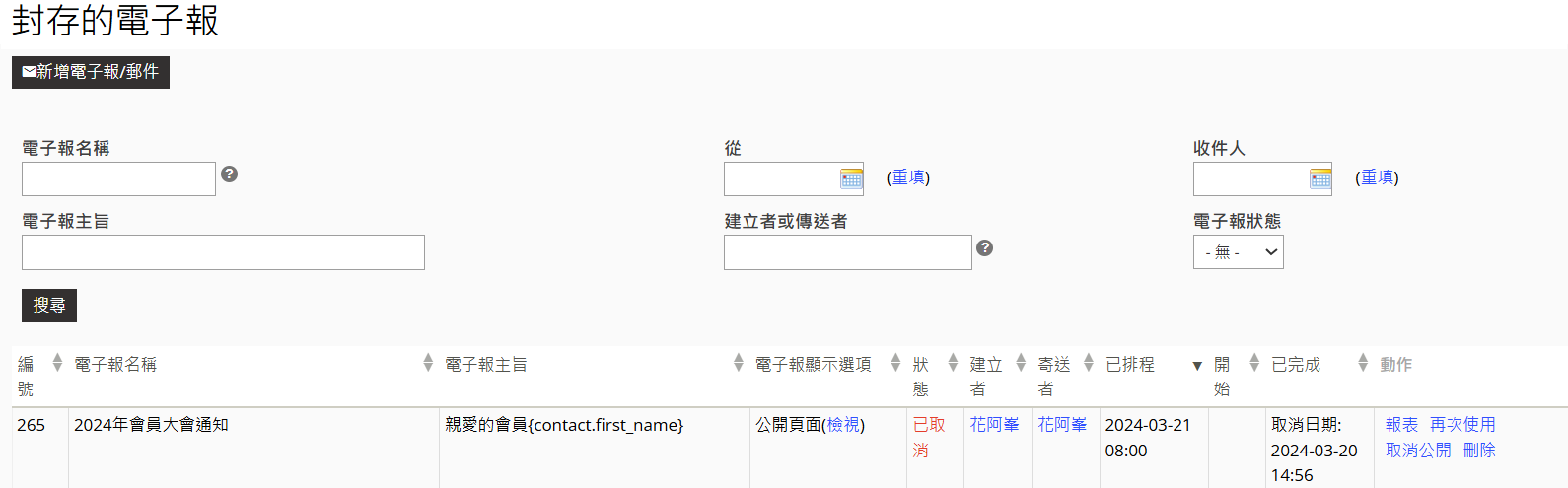 此處可以看到已封存的電子報,在「已排程與已寄送的電子報」中點選「封存」,就可以在此處看到想要特別儲存的電子報,此處的電子報也可以查看報表與再次使用唷!想了解如何查看報表與再次使用,請查參考已排程與已寄送的電子報中的說明。 Book traversal links for 電子報存檔 ‹ 已排程與已寄送的電子報 上 設定 ›