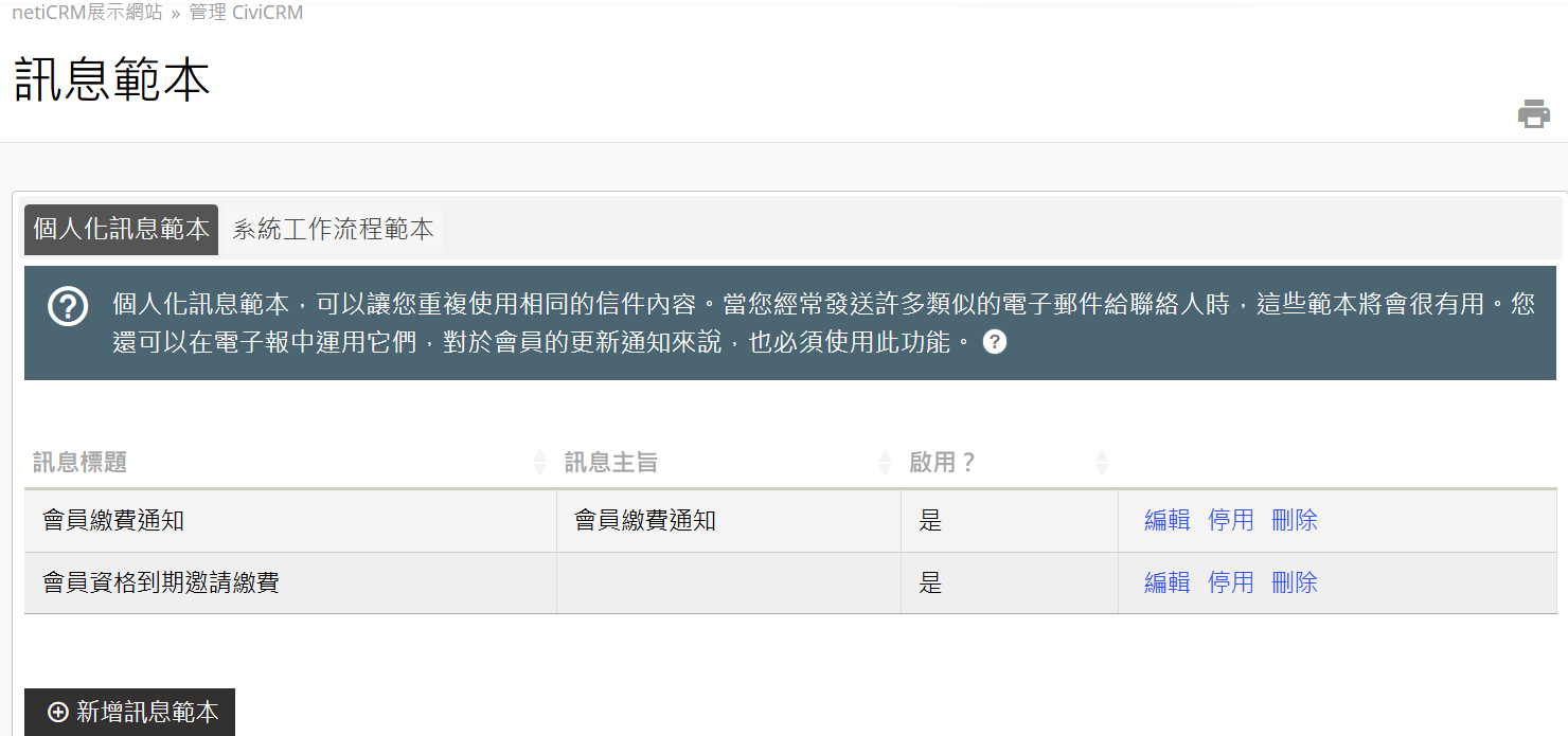 在新增電子報的途中,如果勾選「儲存為新範本」,則可以在此處查看與編輯所有已儲存的訊息範本,建立範本的方法,請參考3/5 編寫電子報內容:儲存與使用範本。