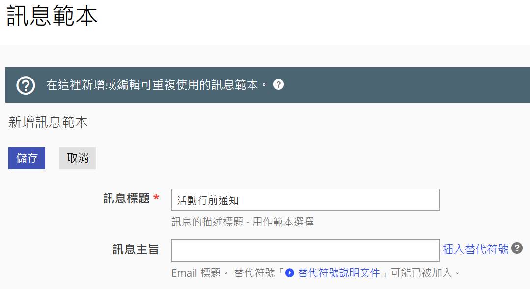 2. 進入建立範本的頁面,請在「訊息標題」填入此份範本的識別名稱(並非電子報或信件主旨喔),例如「活動行前通知」。