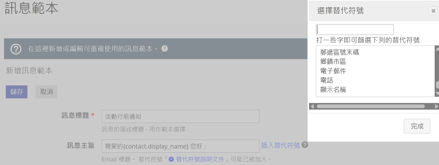 可在訊息主旨中輸入替代符號Token,讓你的訊息有更個人化的標題。例如「親愛的花小花您好,請留意此行前通知!」其中的「花小花」即可使用替代符號,讓每個參加者都收到有自己名字的通知信。選擇「插入替代符號」即可在想要顯示使用者名稱的位置插入名字。想更深入了解替代符號是什麼?請參考 3/5 編寫電子報內容:插入替代符號(token)。