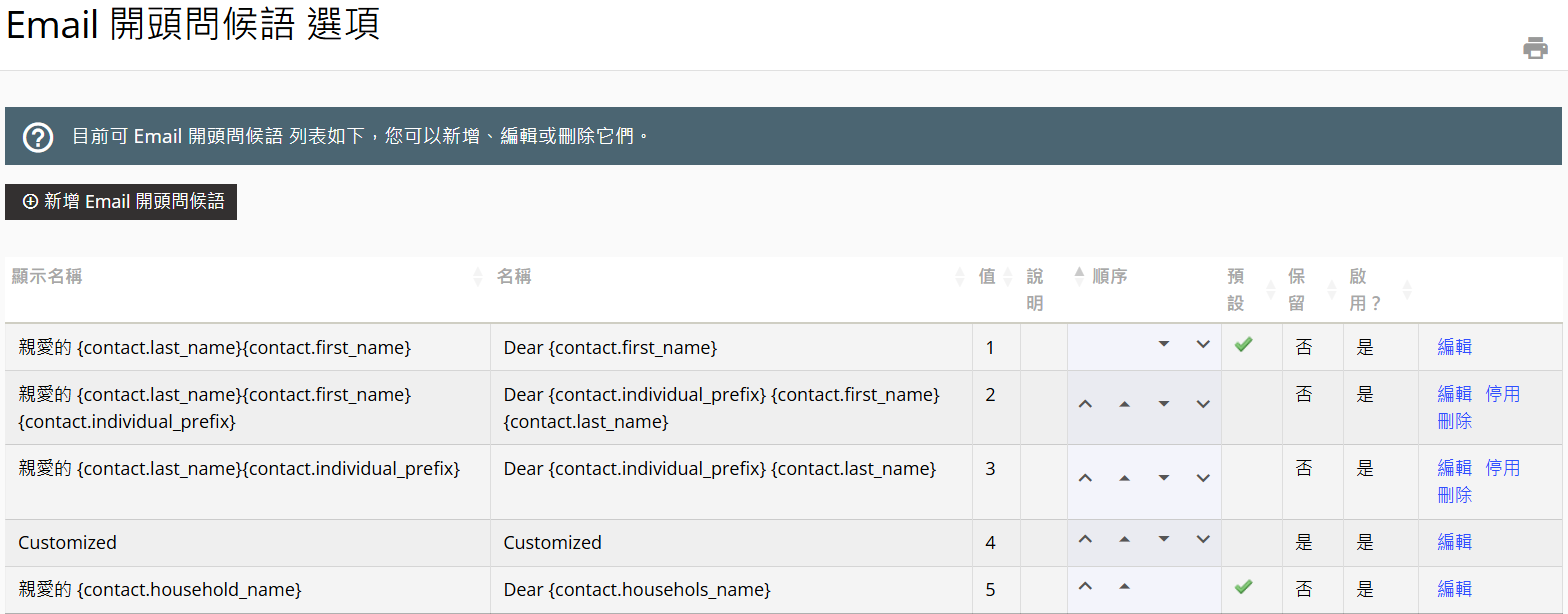 點選「Email問候語」連結後,會看見「Email問候語」列表,可於此處設定 Email 問候語,您可直接編輯系統一開始預設好的問候語,或是新增一個新的問候語並將其設為預設,之後在發送電子報時可在主旨加入「Email開頭問候語」的替代符號,就不需要每次都重新設定問候語囉!