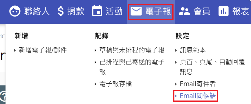 可在頁首主選單中找到Email問候語設定:「電子報」>「設定」>「Email問候語」