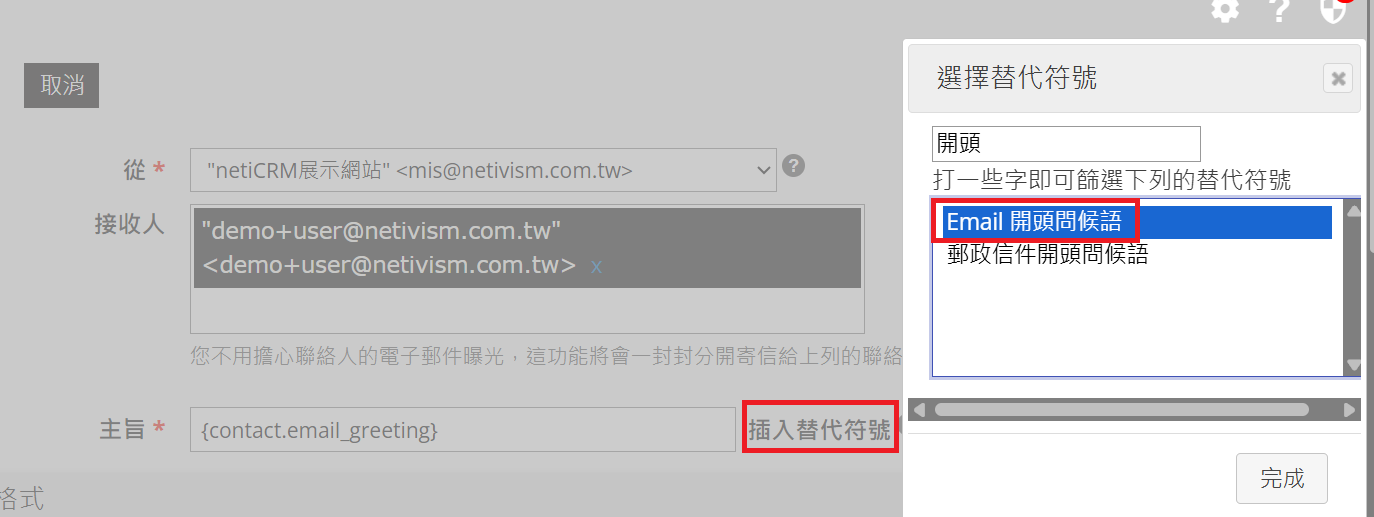 於電子郵件主旨選擇「插入替代符號」插入「E-mail開頭問候語」。