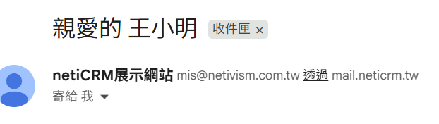 寄出時的主旨會自動替換成相應的文字,預設的問候語為「親愛的 收件人姓名」,故郵件主旨顯示「親愛的 王小明」。