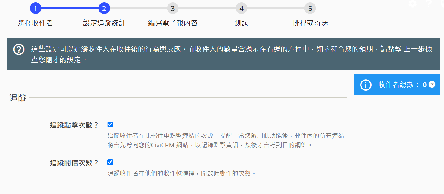 在新增完電子報後,第二個畫面即是設定追蹤統計的頁面,這裡的設定將在寄出電子報後紀錄收件者的相關數據,並彙整到電子報寄送情形報表,作為發報策略擬定或發報內容調整的參考。