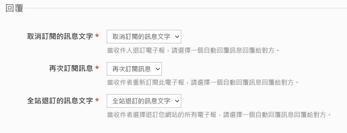 此處可選擇取消訂閱、再次訂閱與全站退訂時系統自動回覆的訊息內容,如想了解如何修改自動回覆訊息的內容,請參考頁首、頁尾、自動回覆訊息