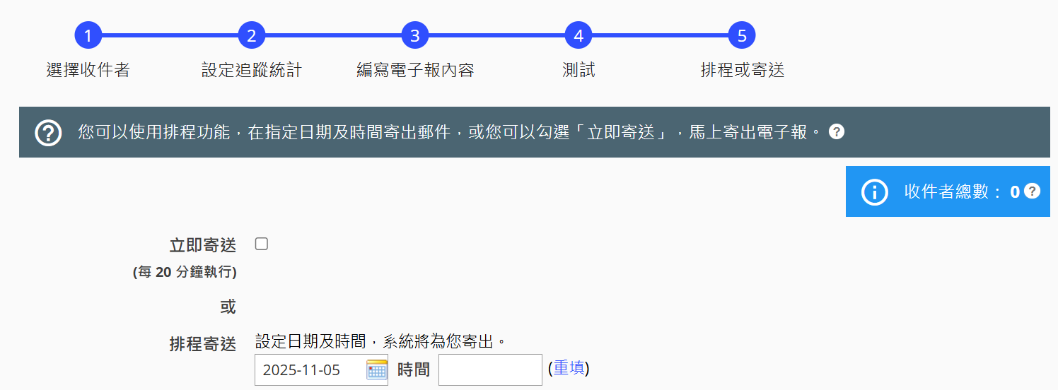 - 如果您的Email名單在10000份以內,建議您排在預期收信當日的凌晨,那可確保當日或隔日可收到