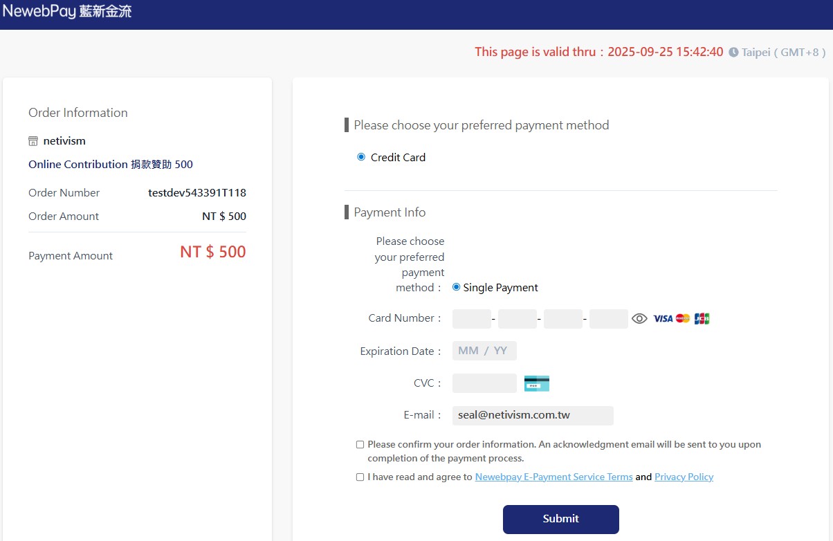 英文介面介接藍新金流的英語介面刷卡頁。(若組織串接綠界金流,也可介接到綠界的英語介面刷卡頁)